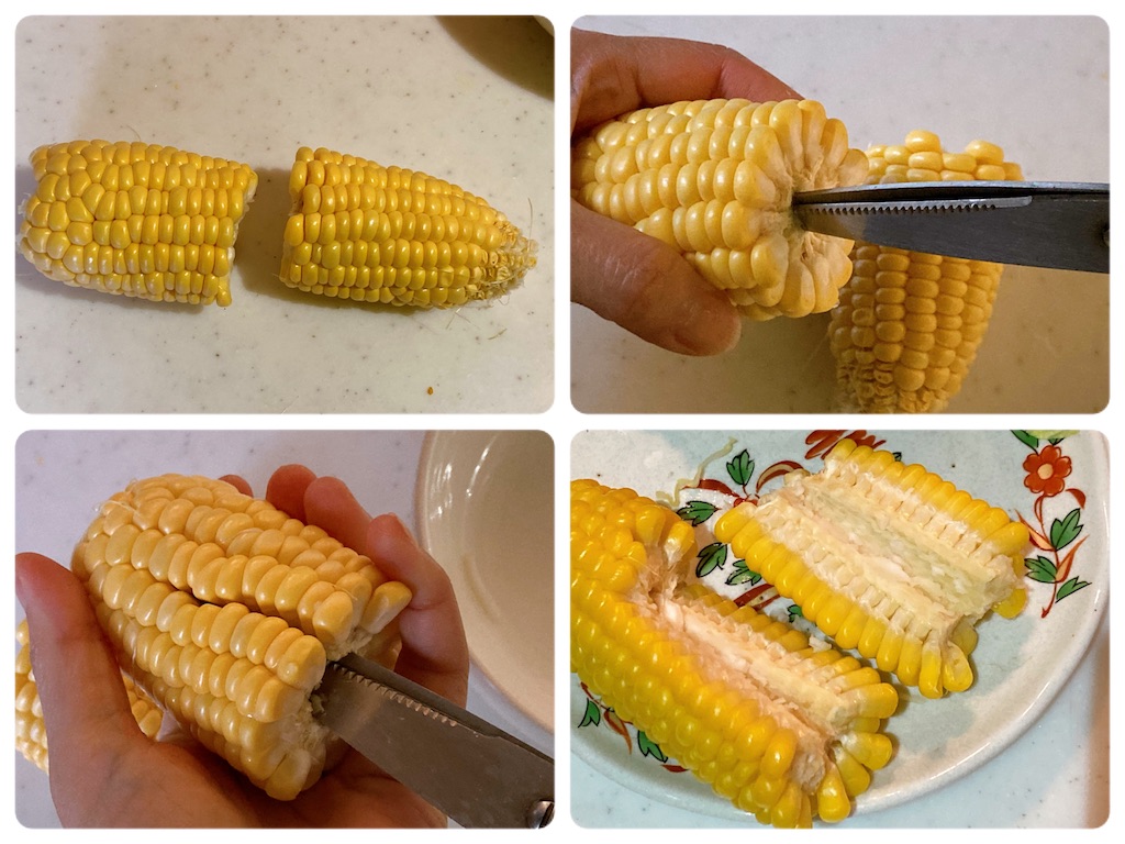 ①とうもろこしを手で折る